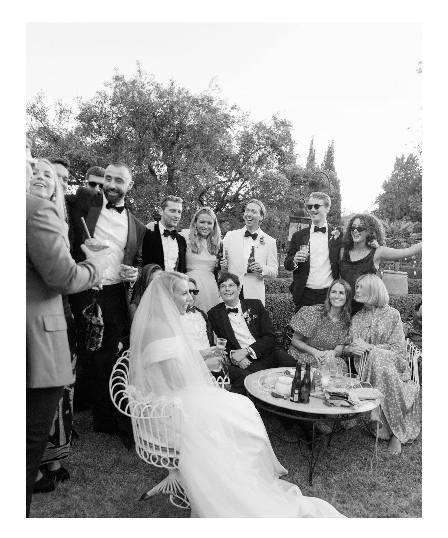 The glass house the ceremony took place in reminded me of Victorian tropical glass houses. Here they were als0 filled with tall exotic greens with huge leaves filling the space perfectly. The floral design utilised terracotta pots filled with yellow and orange blooms creating a colourful backdrop for the ceremony. In fact all the details looked perfect. The room for the dinner was immaculate with candles and florals down the centre of each table creating the right feel. Georgia wore a stunning classic Halfpenny dress while Charlie looked effortlessly cool in a white tuxedo and bow tie. Colour was such a part of this day. The drinks reception took place on the lawns which had paths strewn with lovely red moroccan rugs. While the sun set and as the evening drew in there was a brilliant fire breathing display before dinner. In the nighttime we were treated to an amazing outdoor dance floor repeat with large disco balls hanging above. Charlie himself played some great tunes and the pro DJ played exactly the kind of music I love to hear at weddings, enough familiar tunes to keep everyone happy but an undercurrent of rhythm to keep everyone dancing.