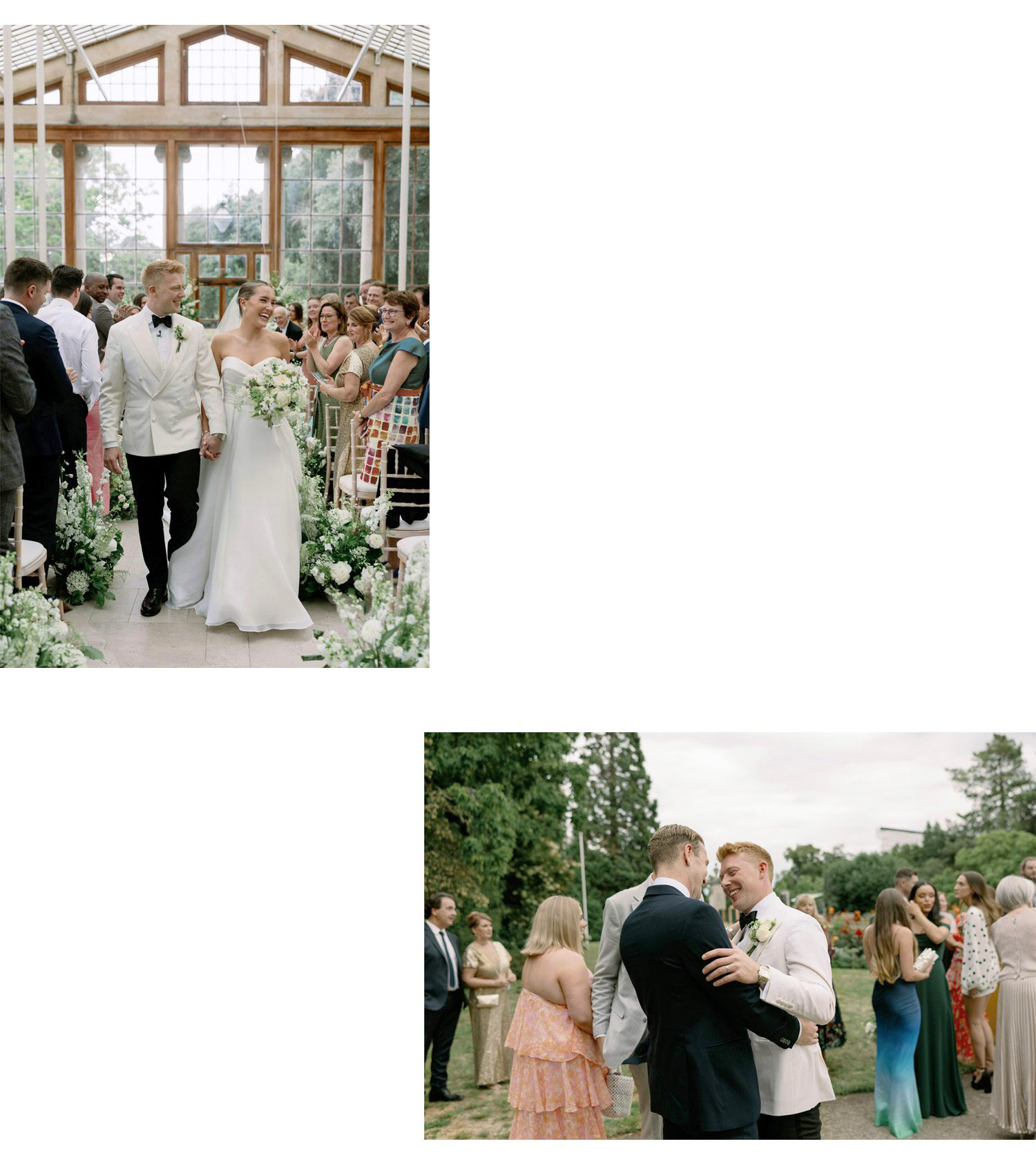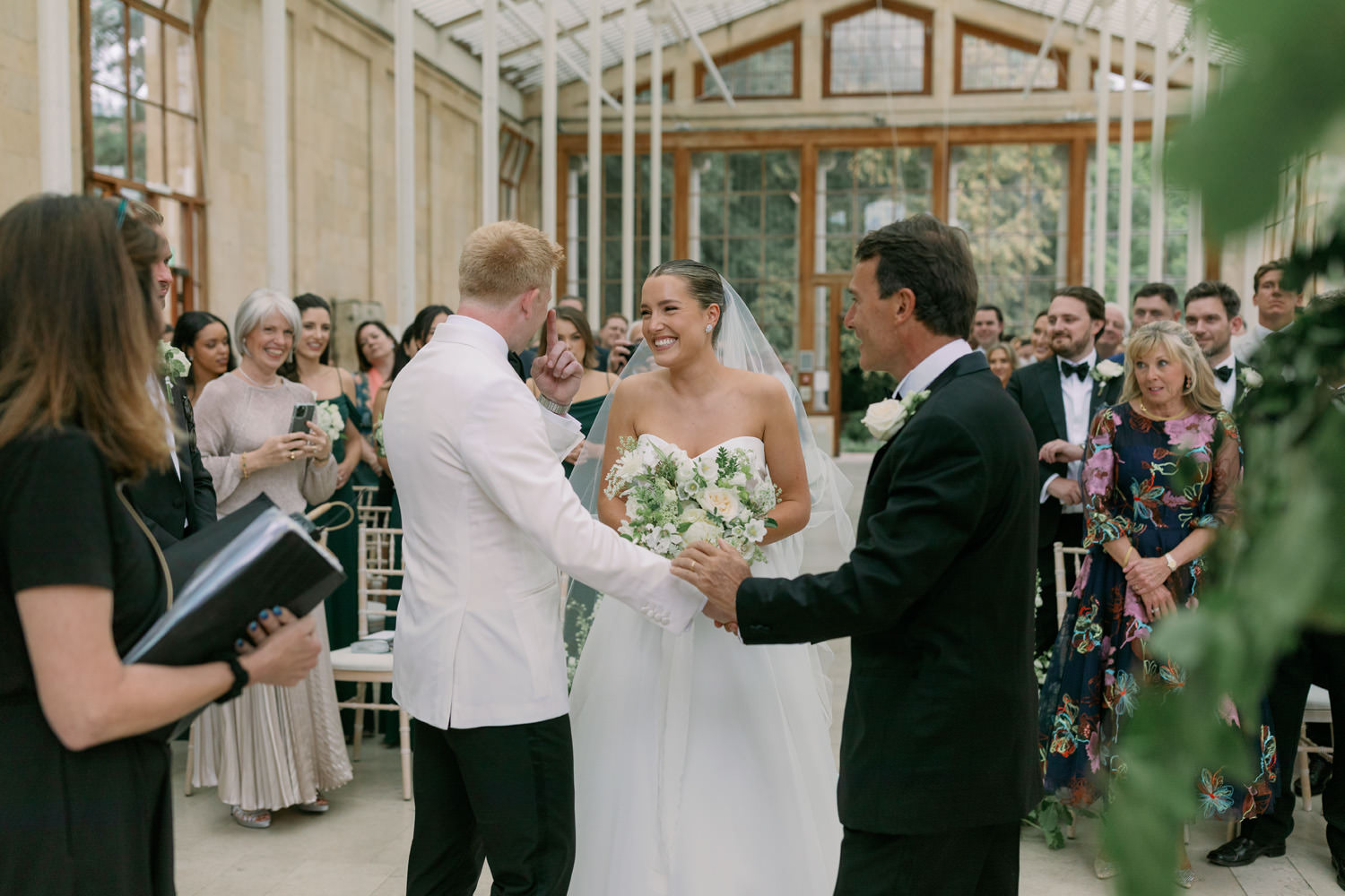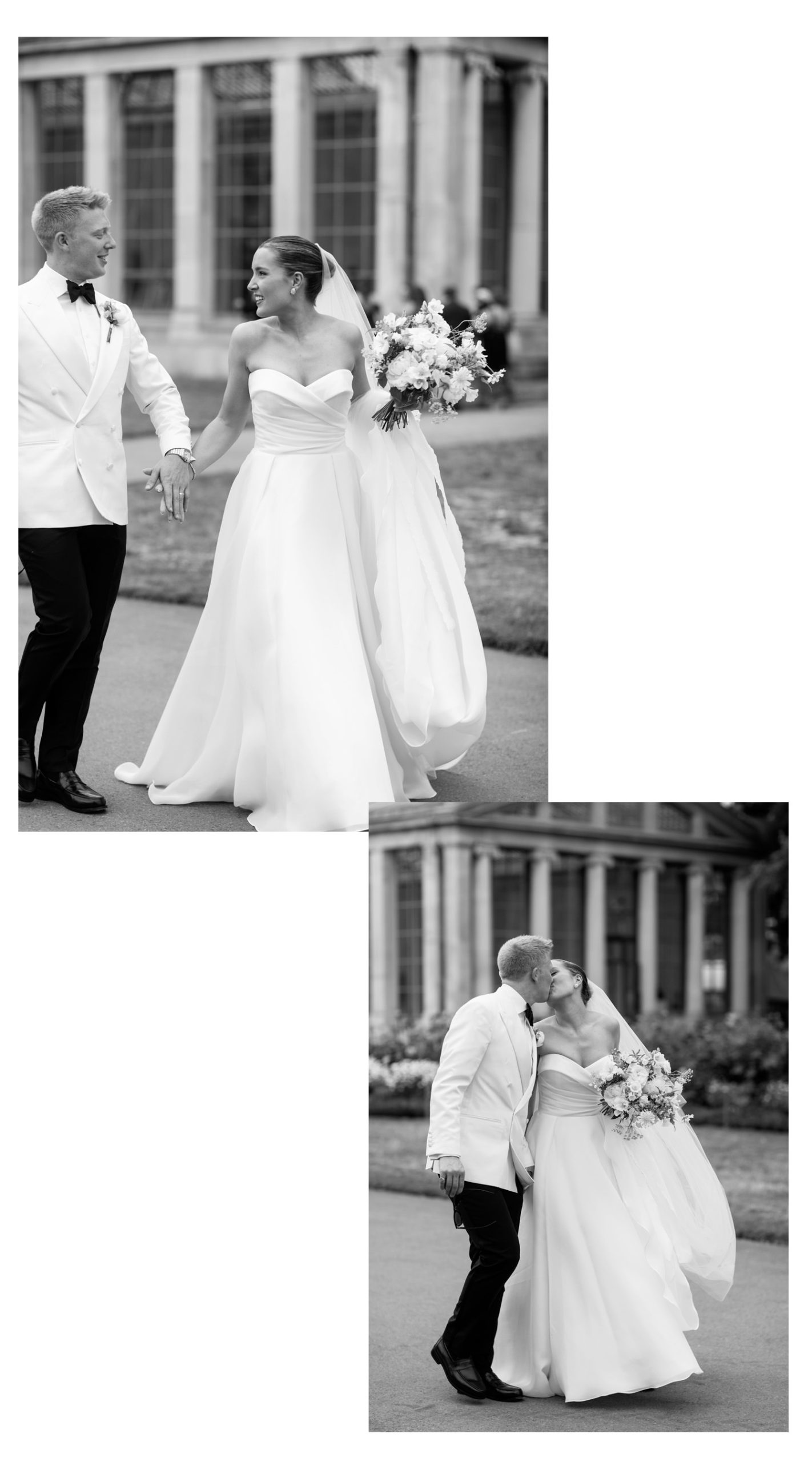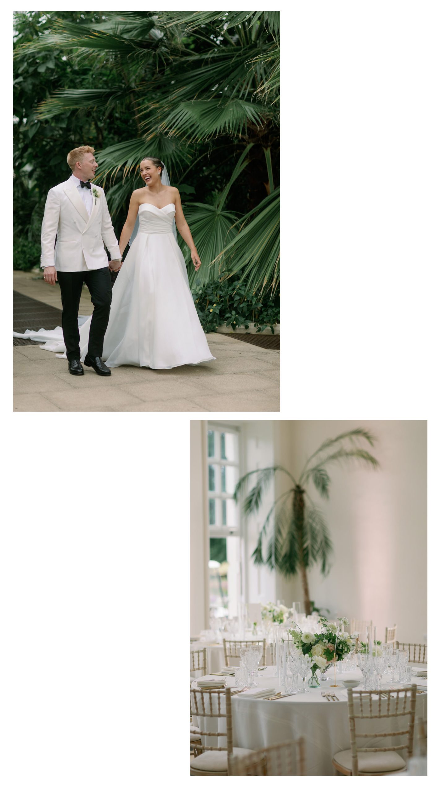 This was a stunning day in London at the iconic Kew Gardens. I don’t think Kim stopped smiling pretty much all day. James wore a classy white jacket. The florals were classic green and white from Blue Sky Flowers. We had the luxury of being driven around the ground to take some portraits in other venues within the garden grounds. In particular Temperate House one of the world’s most famous glasshouses with beautiful palms forming the backdrop for the wedding portraits as well at the exterior glass also.