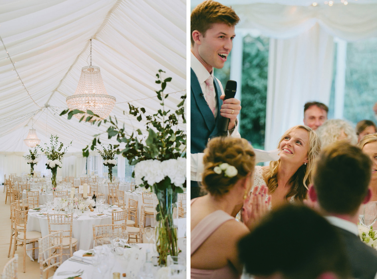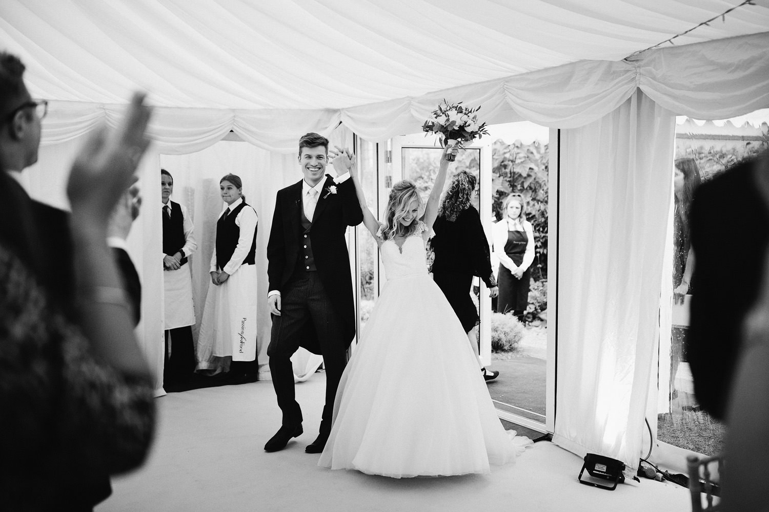 Bride and groom smiling at camera during oxford wedding bride getting ready with mother helping for Oxford wedding oxford wedding dad hugging bride at Oxford wedding bride and groom leave ceremony at their Oxford wedding marquee wedding setting in Oxford bride and groom stood on chair with toast holding glasses aloft first dance at Oxford wedding
